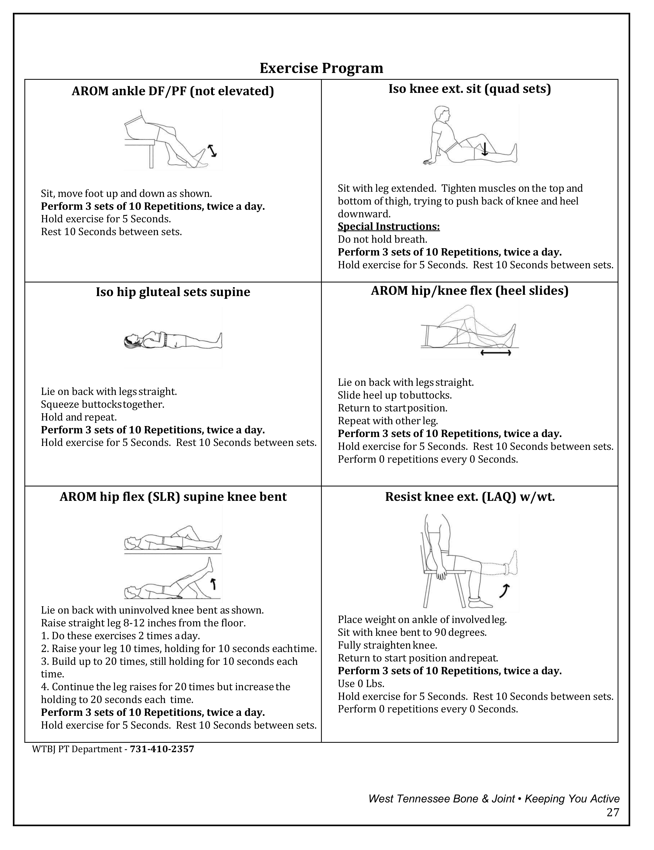 - Exercises: Ankle pumps, heel slides, quad sets, short arc (can) exercises, gluteal sets. 4 way straight leg raises, supine hamstring stretch with belt, knee extension stretch (bumping). Standing calf stretch, calf raises, standing hamstring curls, march in place, mini squats, bike for range of motion (if tolerated)